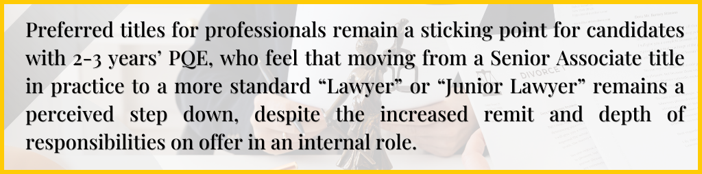 Preferred titles for professionals remain a sticking point for candidates with 2-3 years’ PQE, who feel that moving from a Senior Associate title in practice to a more standard “Lawyer” or “Junior Lawyer” remains a perceived step down, despite the increased remit and depth of responsibilities on offer in an internal role. It means that firms looking to add Legal Counsel or Lawyer roles to their team need to be sure that the PQE requirement will be reflected in the seniority of the role title if they want to attract top talent.