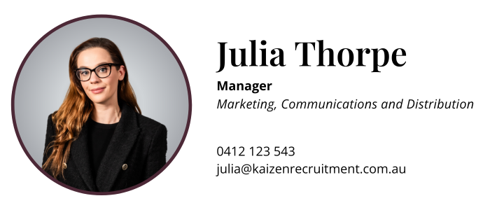 Based in Melbourne and Sydney, Kaizen Recruitment specialises in financial services recruitment nationally across funds management, wealth management, superannuation, investment consulting, fintech and insurance. If you’d like to understand more, discuss candidate career drivers and the current state of marketing, communications and distribution market within the financial services recruitment landscape, feel free to reach out to our team: